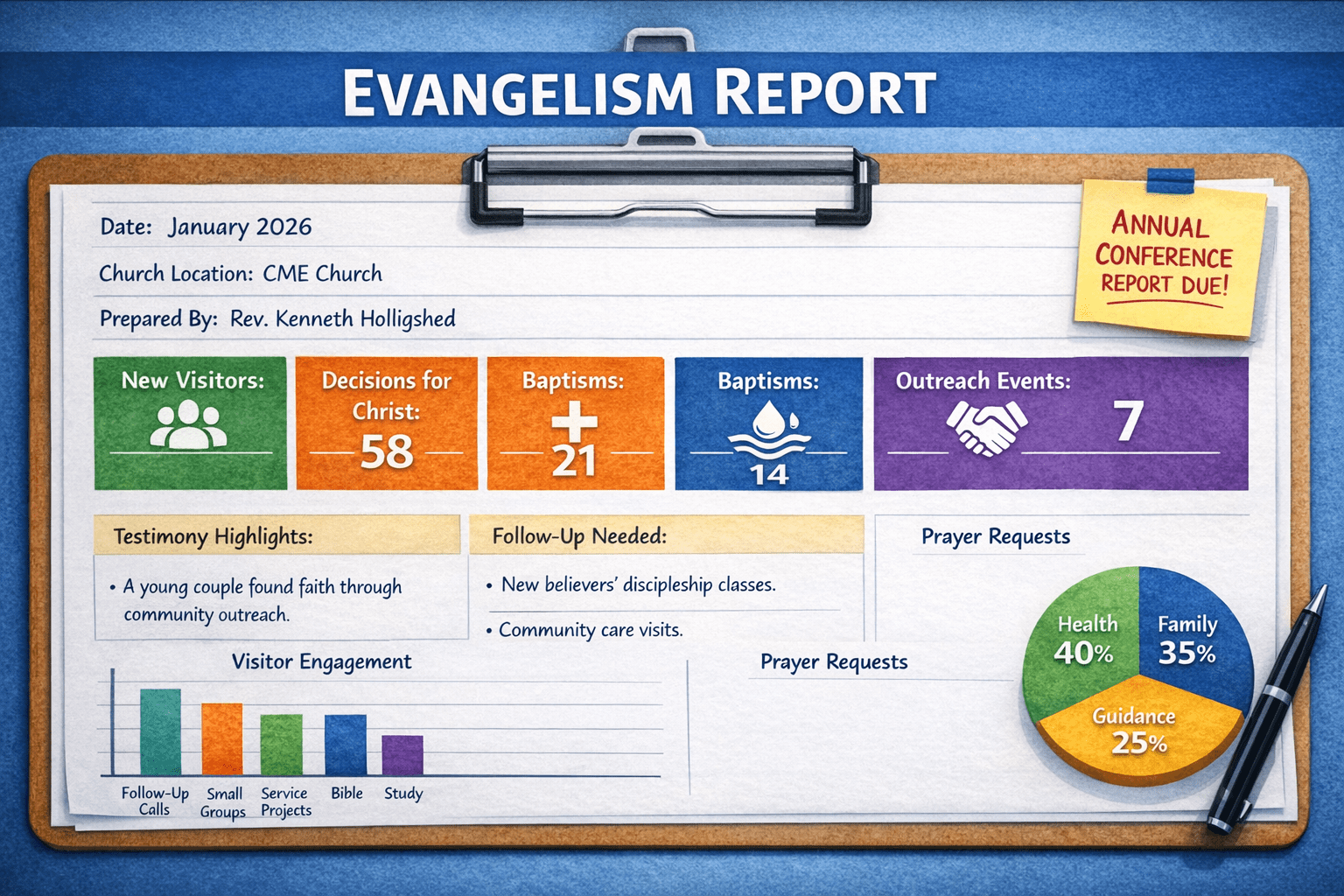 The church today lives within a similar tension. We are constantly submitting reports, and in most churches, required forms play a crucial role in maintaining accountability. In the Christian Methodist Episcopal Church, reports are submitted for church conferences, quarterly conferences, annual conferences, and the general conference. These often include updates on evangelism, attendance, baptisms, new members, and various ministry activities. When I give my brief evangelism report as the Evangelism Director, it reflects the work being done locally in my church, highlights other churches’ evangelism efforts in the region, and offers recommendations intended to strengthen evangelism across the state.